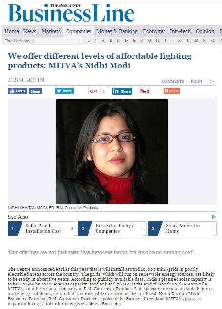 The Centre announced earlier this year that it will install around 10,000 mini-grids in poorly electrified areas across the country. The grids, which will run on renewable energy sources, are likely to be ready in about five years. According to publicly available data, India’s planned solar capacity is to be 110 GW by 2022, even as capacity stood at just 6.76 GW at the end of March 2016. Meanwhile, MITVA, an off-grid solar company of RAL Consumer Products Ltd, specializing in affordable lighting and energy solutions, generated revenues of ₹100 crore for the last fiscal. Nidhi Khaitan Modi, Executive Director, RAL Consumer Products, spoke to the Business Line about MITVA’s plans to expand offerings and enter new geographies.